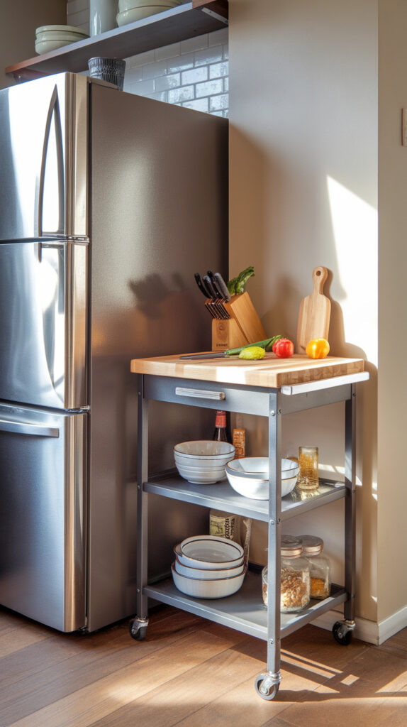 A slim rolling cart adds prep space, storage, and flexibility without locking you into a bulky island situation. I used one that slid between the fridge and the wall, and it earned its keep every single day.