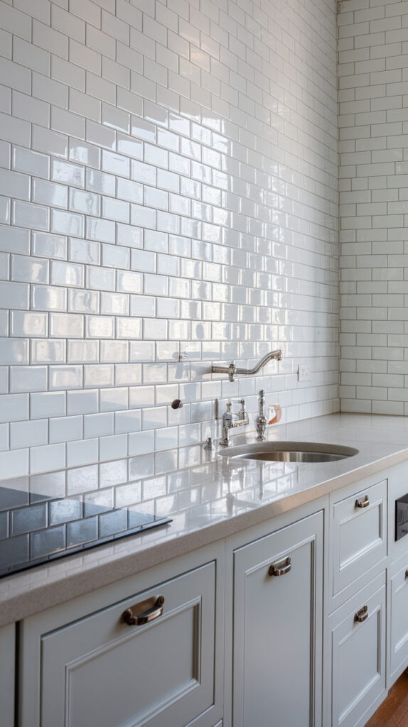 Glossy subway-style designs usually work well because they feel classic and easy to style. Light grout lines or seamless patterns tend to look best in small kitchens since they keep the wall from feeling too chopped up.