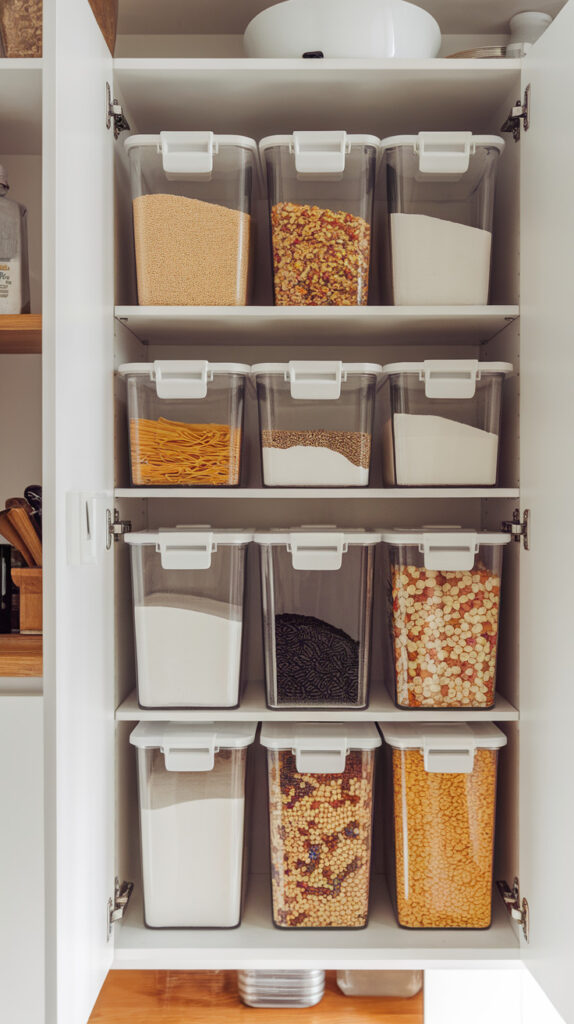 Cabinets get messy fast when pasta, rice, flour, and snacks stay in half-open bags and crumpled boxes. Clear containers fix that chaos and make the inside of the kitchen feel more organized without requiring extra square footage.
