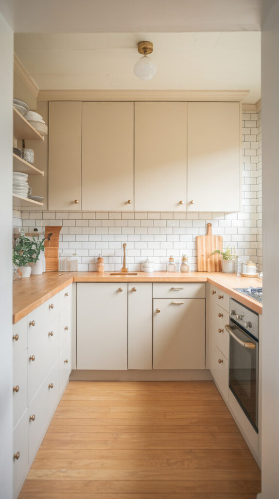 Warm neutrals usually look better than stark bright white, especially in kitchens with limited natural light. Soft white, greige, and light taupe all help a kitchen feel airy without making it look cold or flat.