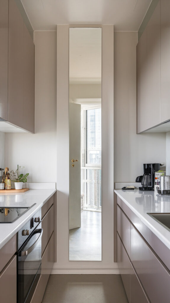 Mirrors aren’t just for hallways and bedrooms, and small kitchens can benefit from them more than people expect. A well-placed mirror bounces light around and gives the room a little visual depth without taking up any actual space.