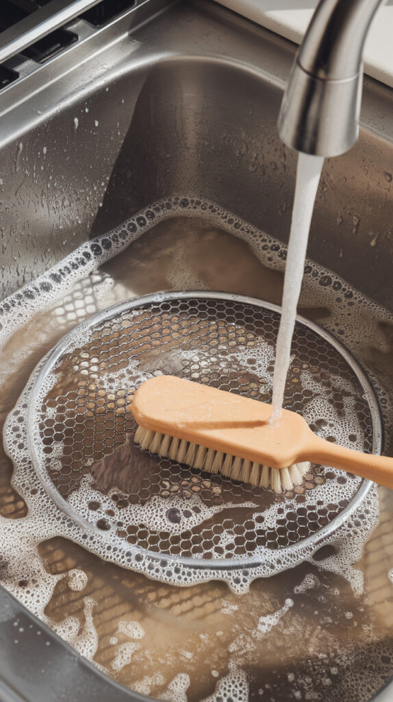 • Rinse the filter under warm water and scrub gently with a soft brush to remove grease and trapped food.