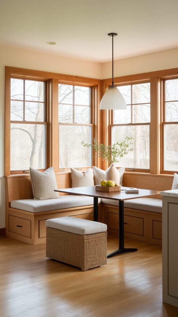 The window seat doubles as seating and visual interest. It uses space that often goes ignored. Natural light enhances the experience.