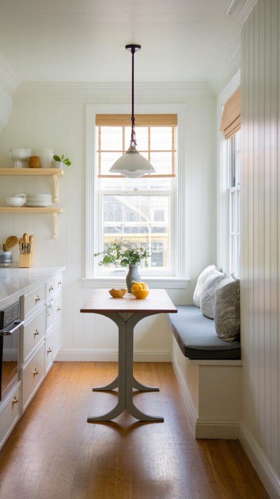 Galley kitchens need smart solutions. A slim bench and wall table fit perfectly. I admire how efficient this setup feels.