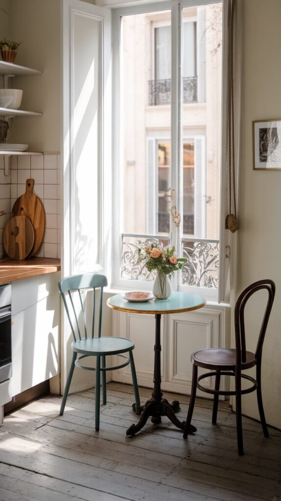 A small round table instantly changes the mood of a kitchen. It signals conversation, not chaos. I always associate this look with tiny Paris apartments, even if the kitchen sits in a regular suburban house.