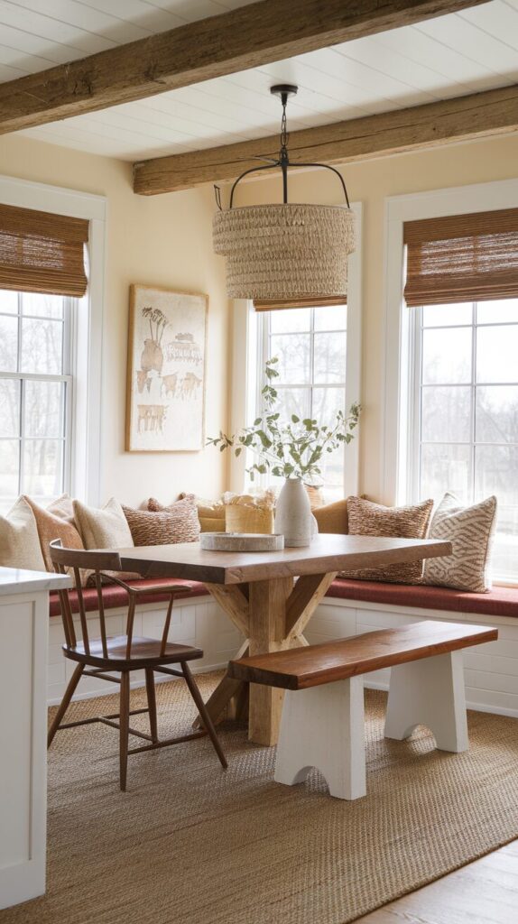 6. Rustic Farmhouse Nook with Mixed Seating