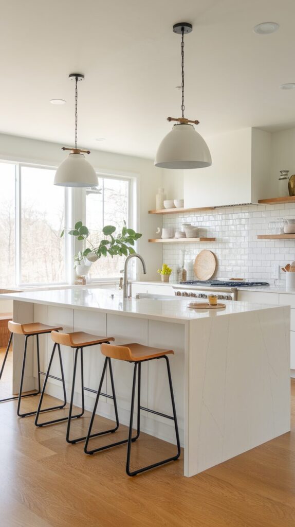 Everyone talks about islands, but not every kitchen needs one. A slim breakfast bar under a window gives you a peaceful place to eat without crowding the room. I like this setup because it feels calm and slightly indulgent, like a weekday luxury.