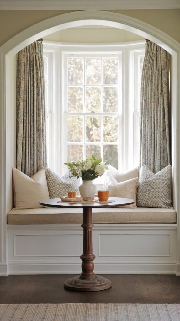 Window seats feel nostalgic in the best way. Add a small table, and you get a functional nook with charm. I always gravitate to these spots first.