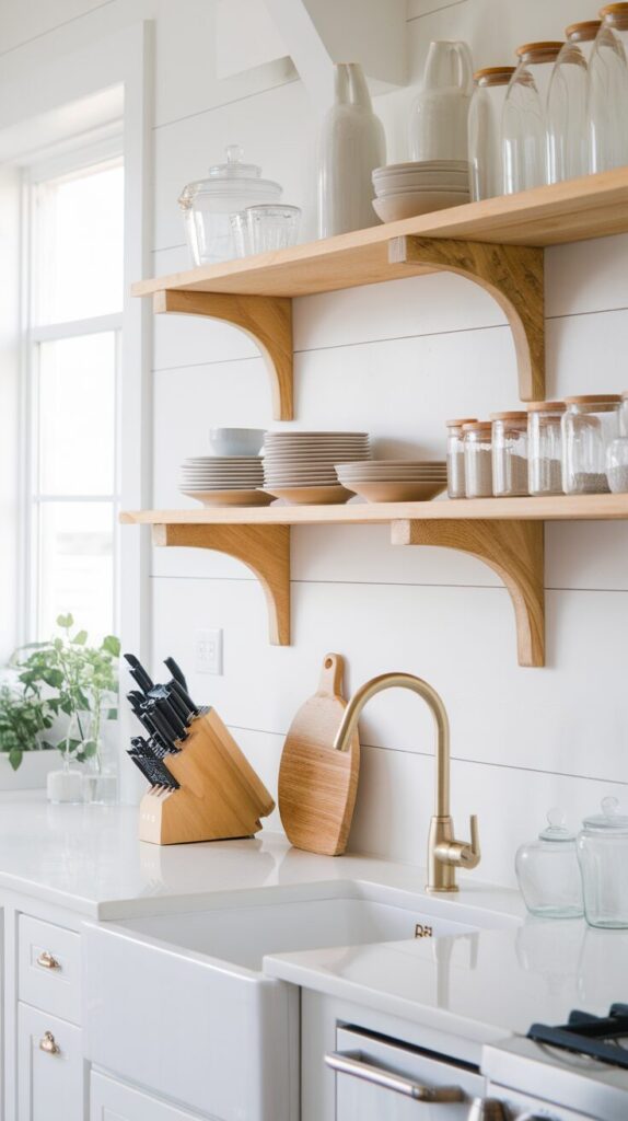 Open floating shelves always sit at the top of my recommendation list, and for good reason. They instantly open up the kitchen and make even small spaces feel breathable.