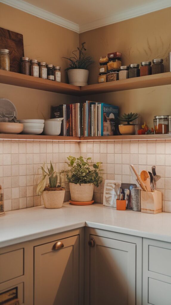 Corner shelves allow you to use space that cabinets often waste. They create visual interest while adding storage where you least expect it, which feels oddly satisfying.