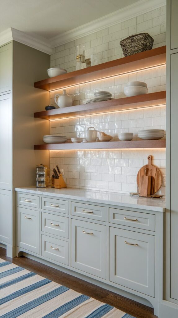 Display shelves showcase personality without sacrificing usability. They make your kitchen feel lived-in and welcoming, which guests notice immediately.