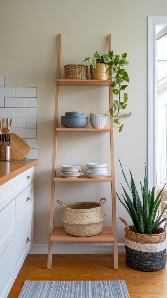 Ladder shelves add height and style, and they instantly draw the eye upward. I love them in kitchens with high ceilings or blank walls.