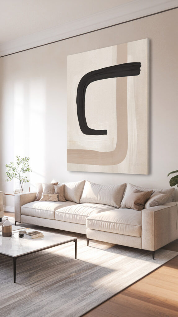 Abstract art works well if your room already has patterns, because it won’t fight your pillows and rug. Landscapes and photography feel calmer, especially in neutral living rooms.