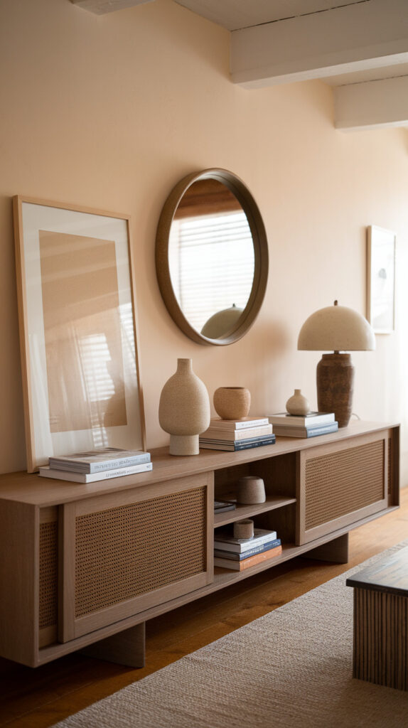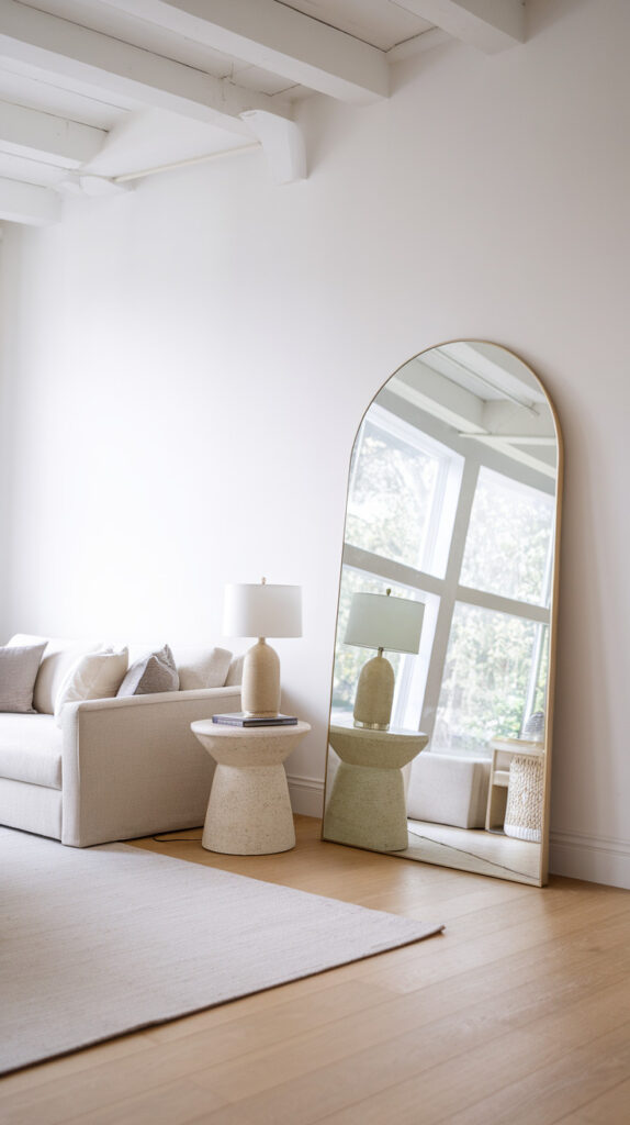 A large mirror also gives the wall purpose without needing a bunch of extra decor. It creates a strong focal point while staying visually “clean.”