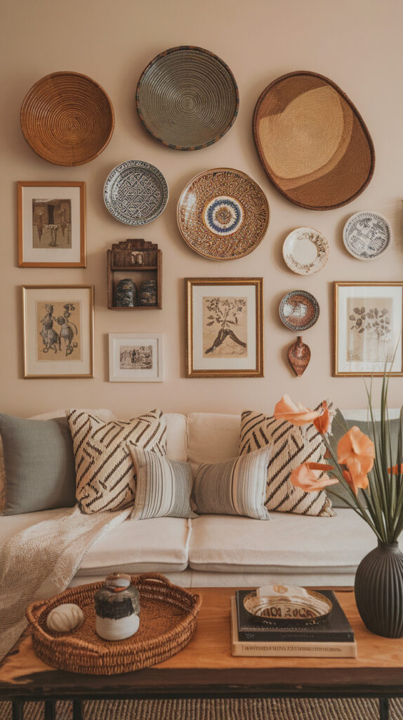 Aim for pieces that relate proportionally to your furniture. If the wall sits behind a sofa, décor should span at least two-thirds of its width to feel balanced.