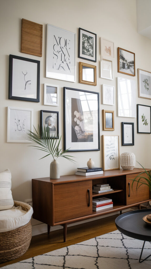 Repetition creates cohesion. Whether it’s repeating a wood tone, frame finish, or shape, consistency ties the wall into the rest of the living room so it doesn’t feel like a separate project.