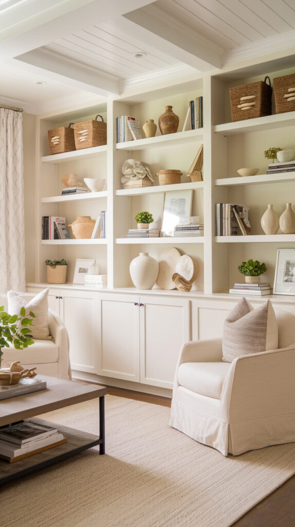 - Decorate using a mix of books, baskets, and art pieces.