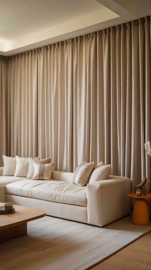 Add texture and layering. Fabric elements like curtains, wood accents, and warm-toned art soften large surfaces effectively.
