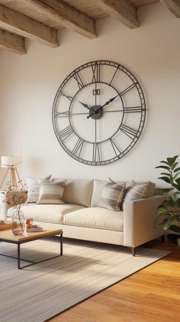 A large wall clock is a classic solution, but it only works if you pick one that actually looks stylish. A cheap clock can make your living room feel like a waiting room, and that’s not the vibe.