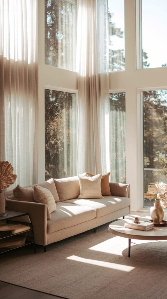 Here’s a simple idea with big impact—orient your seating to take advantage of natural light and views. A sofa facing the windows makes the whole room feel more open and airy.