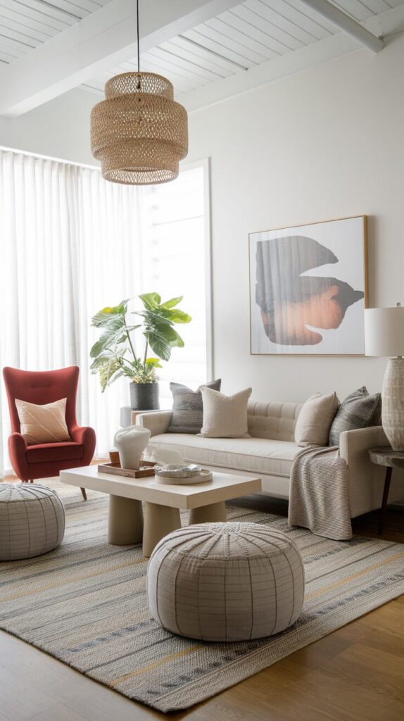 It also boosts functionality. Low poufs are perfect for casual lounging, while taller chairs give a more formal feel. Together, they balance comfort and style.