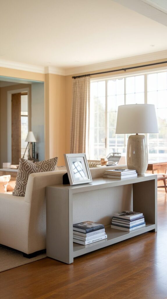 Here’s a unique twist for open layouts: place a console table right behind your sofa. It acts like a subtle divider, giving definition to the living area without blocking light or flow.