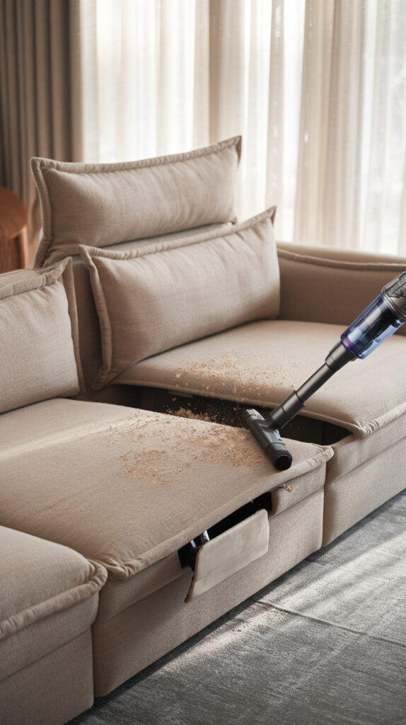 Most people vacuum the seat surface and call it done, but the hidden spots matter more. Dust and crumbs collect under cushions and along seams, and those areas cause odors and fabric wear if they stay ignored.