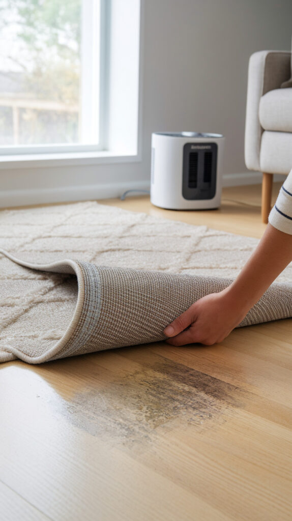 - Lift rug corners occasionally and inspect the floor underneath for dampness or discoloration.