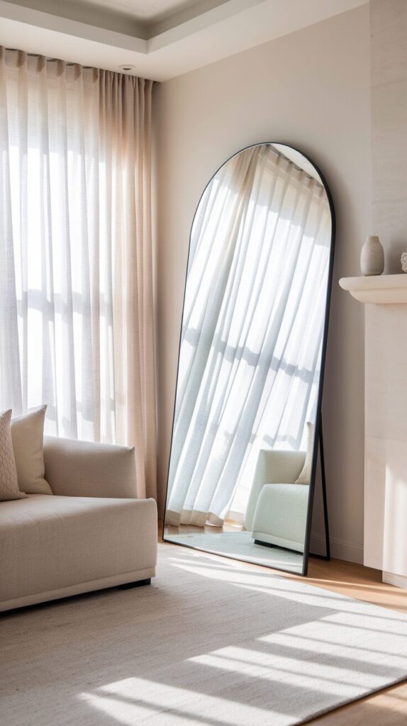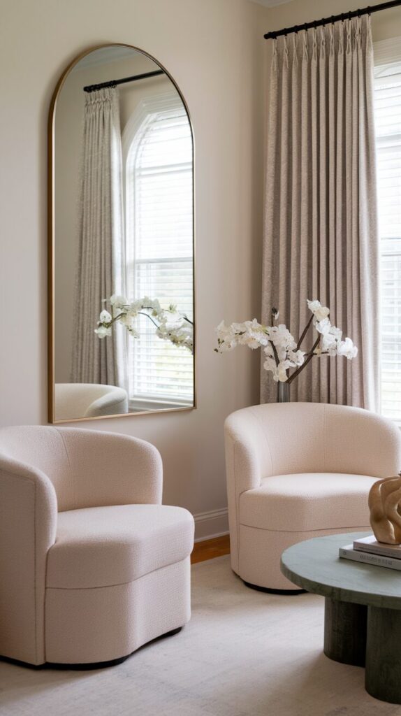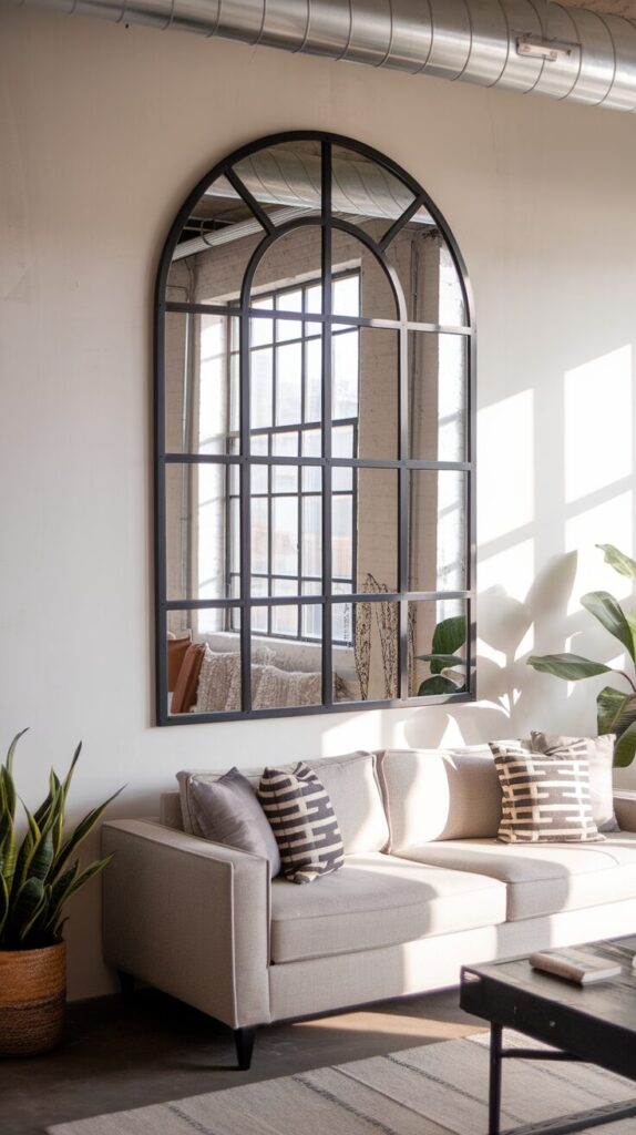 Straight edges dominate furniture. An arched mirror adds softness instantly. I love how it calms visually busy rooms.