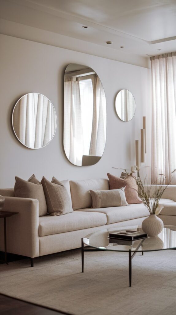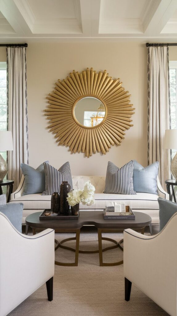 I measure the wall height and seating arrangement before hanging anything. Mirrors should align with furniture lines, not float randomly above them. Proportion always determines whether a room feels polished or awkward.