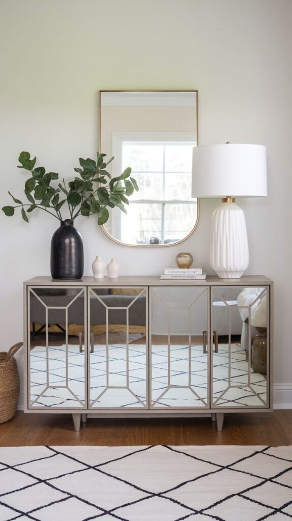 Storage pieces often feel bulky. Mirrored doors lighten them visually. I use this trick in compact living rooms.