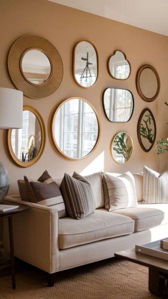 Flat walls get boring fast, especially when everything lines up too perfectly. A mirror gallery wall adds texture, movement, and sparkle without needing art. I tried this once out of curiosity and ended up obsessed.