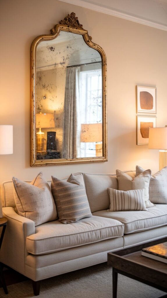 Your sofa wall usually carries the visual weight of the room. Hanging an antique-style mirror there adds character without shouting for attention. I prefer slightly distressed glass because it feels collected, not staged.