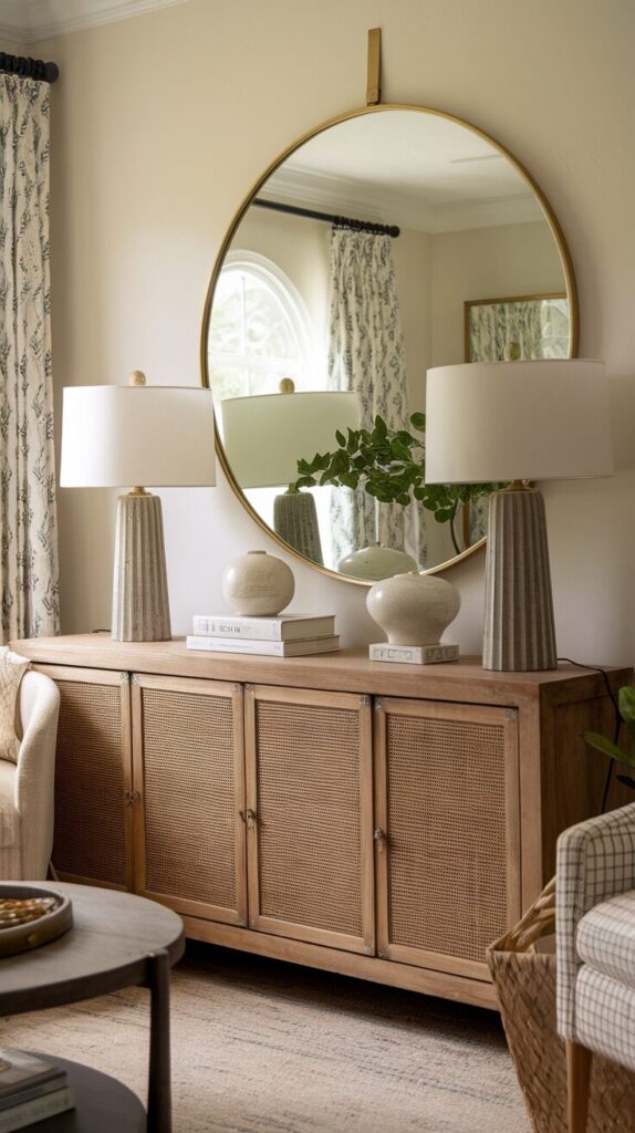 Hard lines dominate most living rooms. A round mirror softens everything instantly. I use this when a room feels too boxy or rigid.