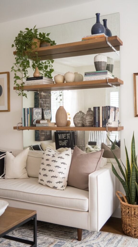 Shelves often look flat or cluttered. Adding a mirror behind them changes everything. I use this trick in small living rooms constantly.