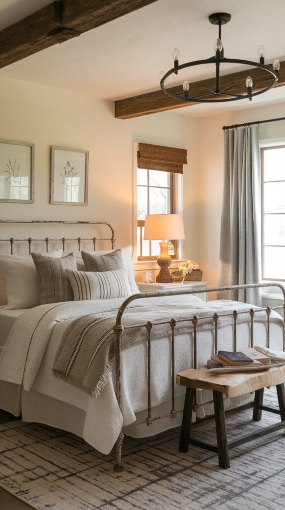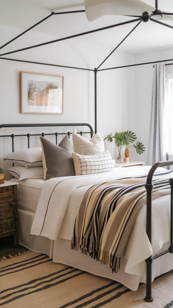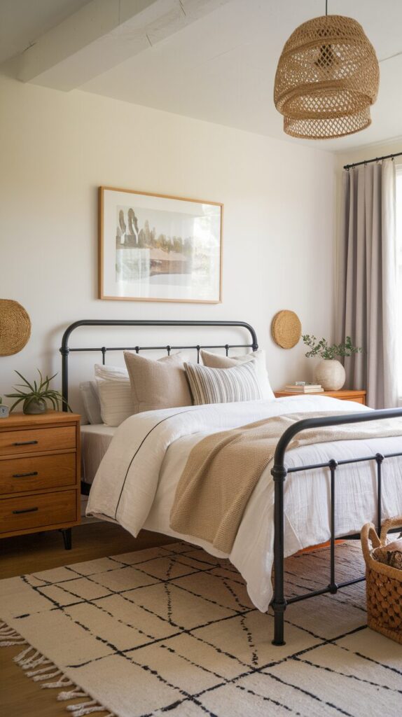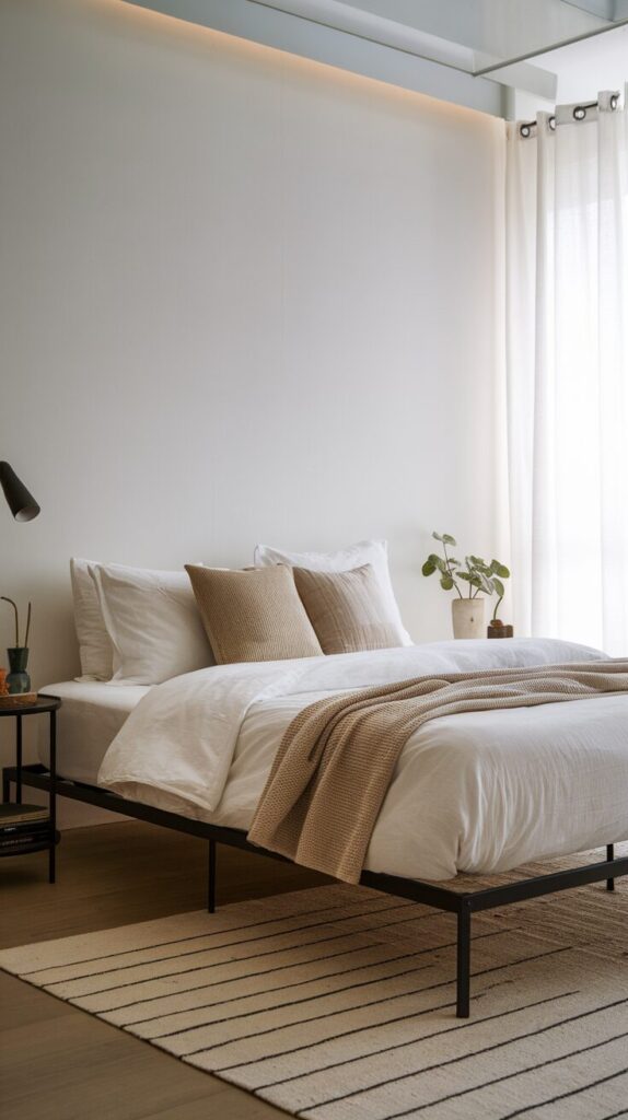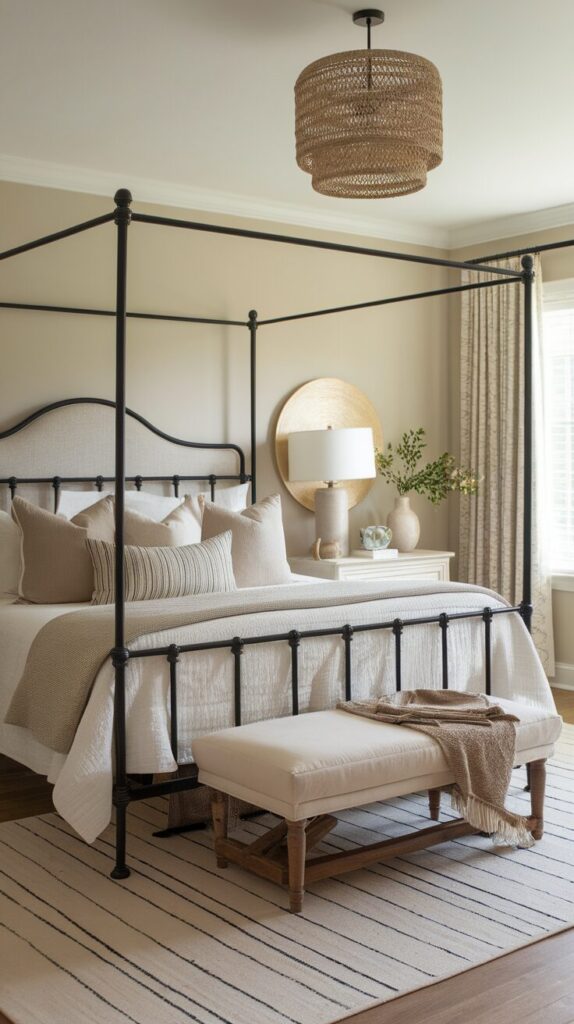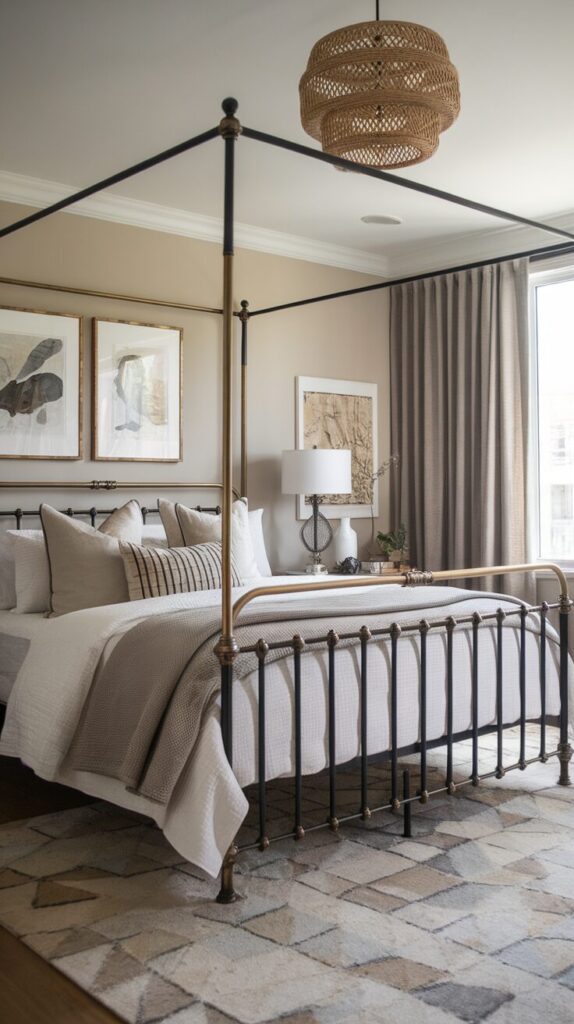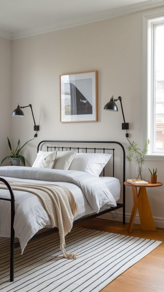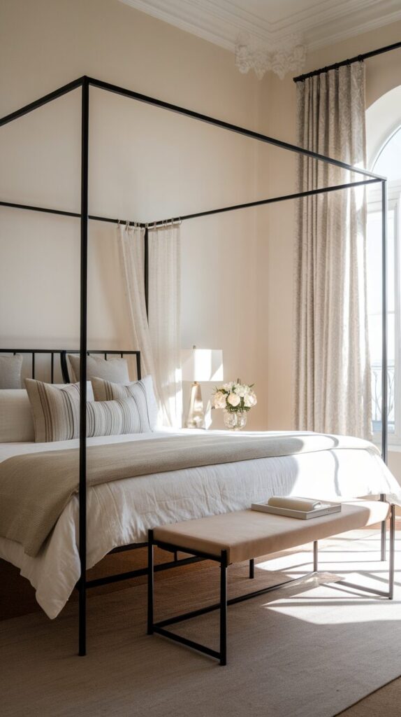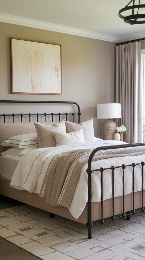 Neutral rooms need contrast or they fall flat. A black metal bed adds just enough edge. It anchors the space without overpowering it.