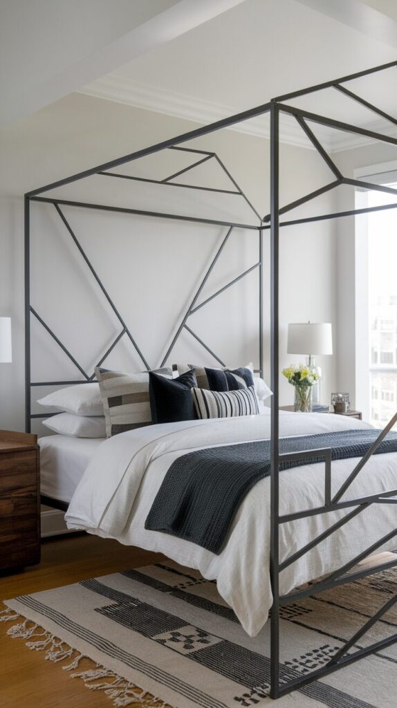 Canopy beds sound dramatic, but metal versions feel lighter than you expect. They add height and presence without overwhelming the room. This one always surprises people.