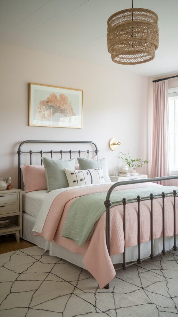 17. Metal Bed Frame Paired With Soft Pastels