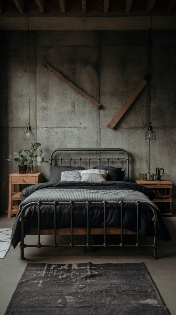 Exposed hardware adds honesty and edge. The bed frame feels architectural instead of decorative. It sets a clear tone for the entire room.