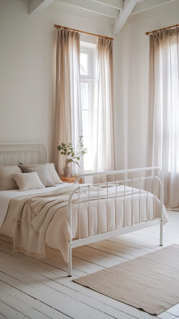 White metal beds feel fresh and slightly romantic without going full cottage-core. I love this look in smaller bedrooms that need visual breathing room. The frame almost disappears in the best way.