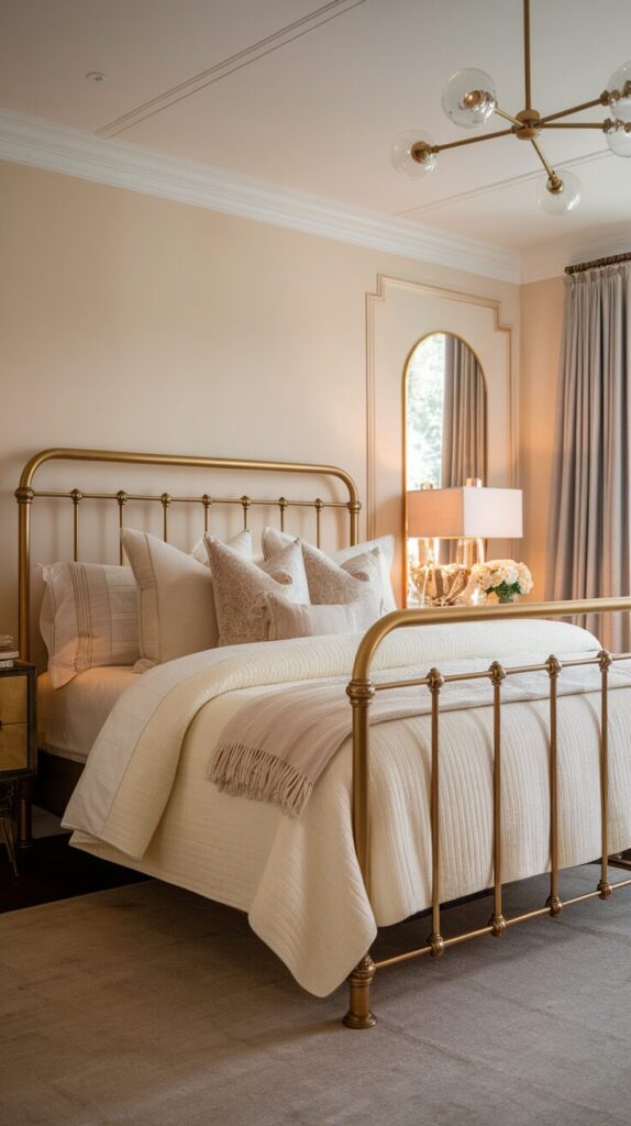 Warm metallic tones reflect light softly. They add elegance without needing extra décor. The bed frame becomes jewelry for the room.