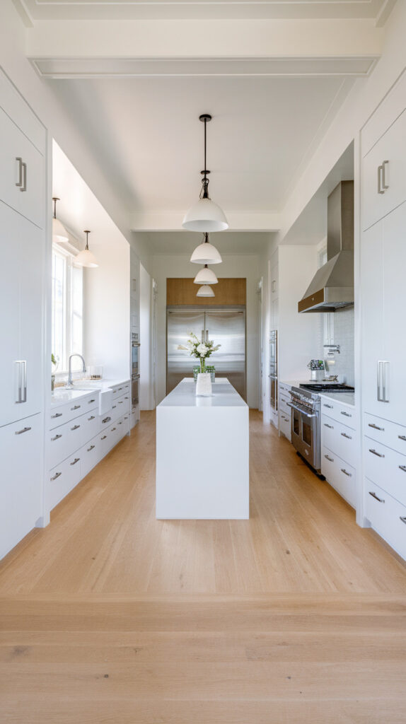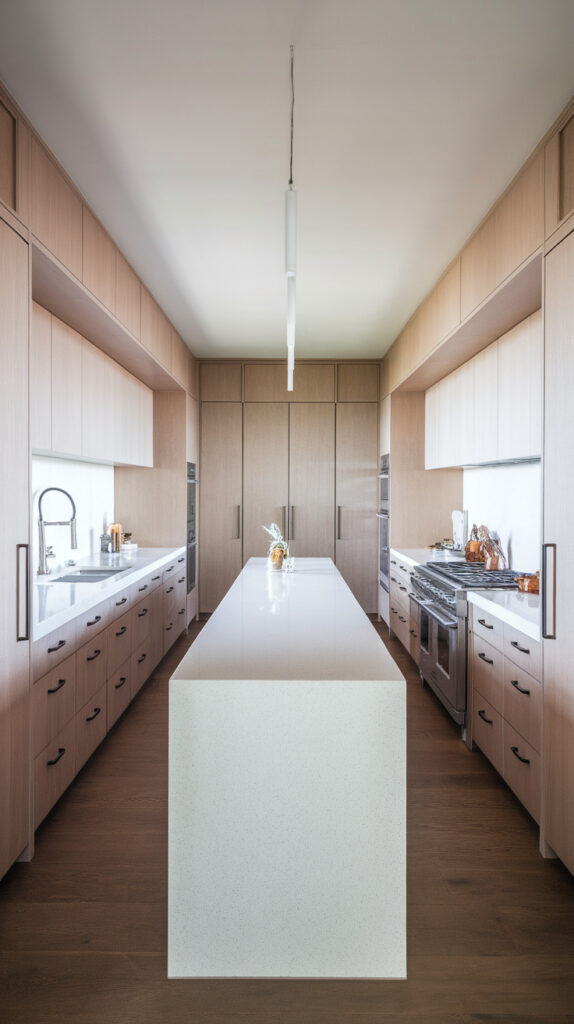 Long galley kitchens can feel like hallways. Adding a slim island down the center creates a “runway” effect that organizes the layout.