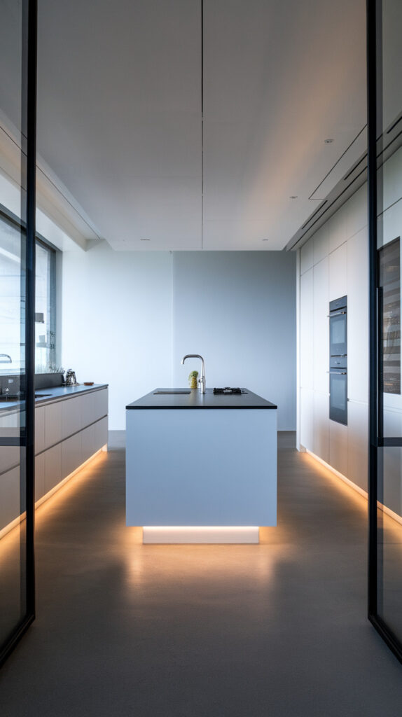 For extremely narrow kitchens, remove bulky toe kicks and create a floating effect.