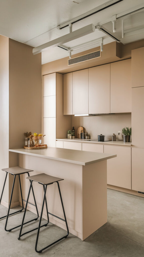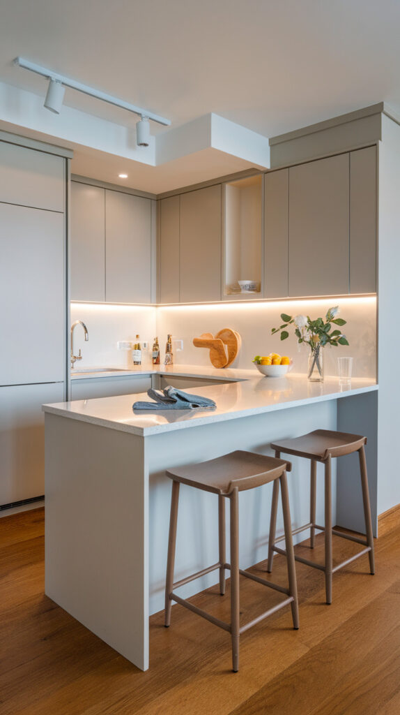When full islands feel impossible, attach one side to a wall and create a peninsula layout. It behaves like an island but uses less clearance.