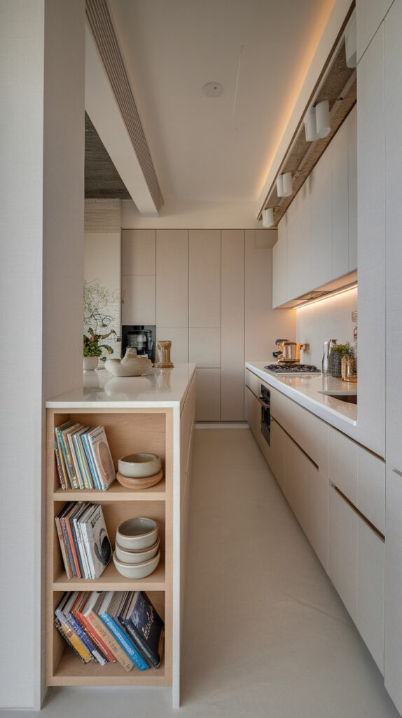 Vertical wall space remains valuable in narrow kitchens. Slim floating shelves or shallow cabinets add storage without crowding walkways.