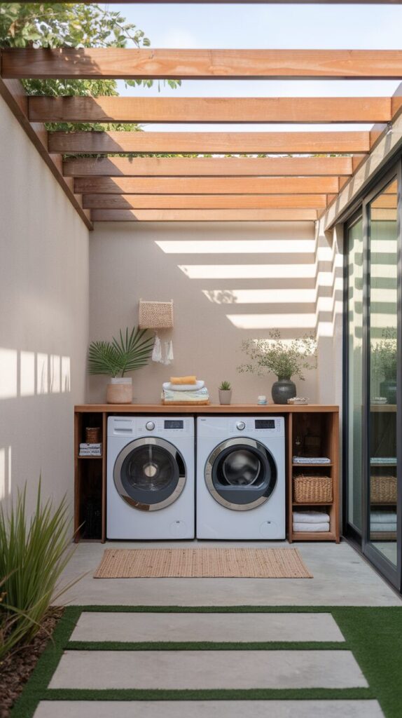 I always cringe when I see a washer sitting naked under the sky like it lost a bet. A covered patio laundry nook fixes that mess and instantly makes the setup feel permanent and polished. You get protection from rain, sun, and dust while keeping everything right where you need it.