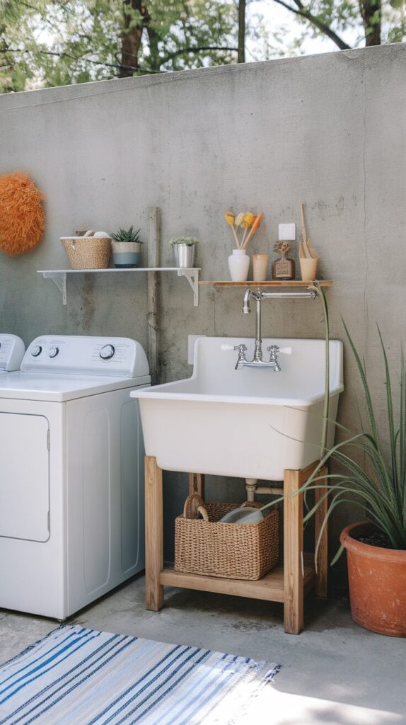 Every outdoor laundry setup needs a sink, and I will die on this hill. Muddy shoes, paint brushes, and pet bowls demand a proper rinse spot. A utility sink keeps messes outside where they belong.
