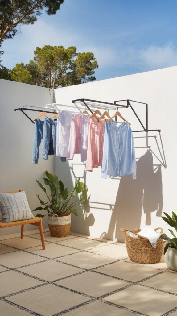 This idea works because airflow dries clothes faster outdoors. Pull-out racks save space while giving you flexibility. You reduce dryer use and extend clothing life at the same time.