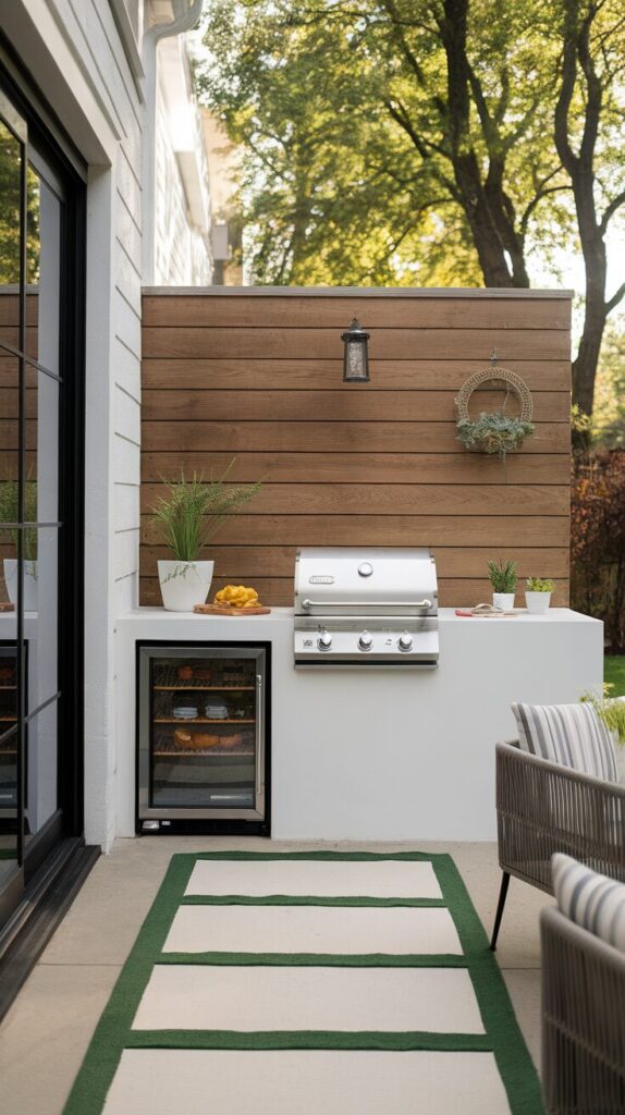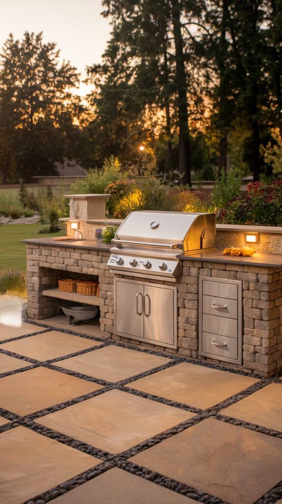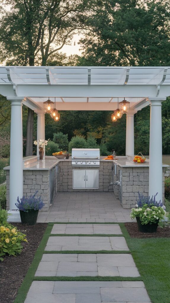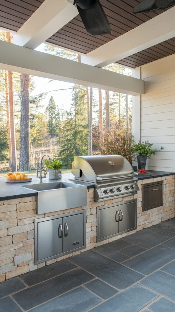 A built in grill station gives your outdoor kitchen a solid, finished look. I love how it anchors the entire space and instantly makes the area feel intentional. Who does not enjoy flipping burgers at a setup that looks like it belongs in a magazine?