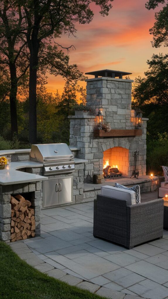 I place fireplaces near seating, not cooking zones. This setup balances function and relaxation. Fire elements add year round usability.